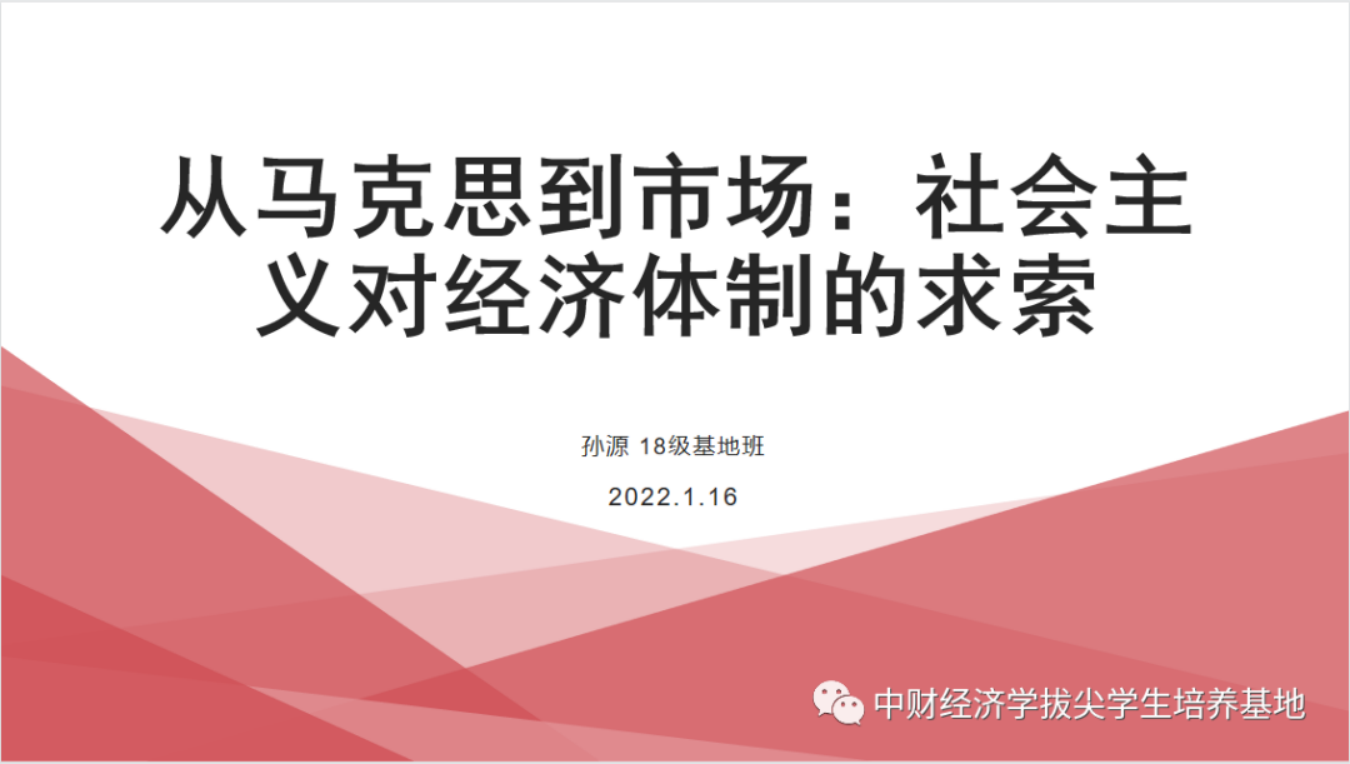 首先,孙源同学分享了布鲁斯、拉斯基所著的《从马克思到市场:社会主义对经济体制的求索》,从作者介绍、前言、内容和个人感受四个方面对整本书做了介绍。本书的目的在于,从理论和经验事实两方面考察苏联式社会主义经济体制失败的根源,从而说明为什么要探索市场趋向的解救方法。作者趋向于达到市场社会主义的经济体制。对于中国,这本书对探索未来演进的道路,理解转轨过程的逻辑和未来变化的要求仍然十分重要。