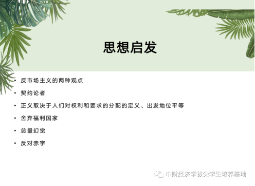 最后,马金瑶同学详细介绍了《自由、市场和国家》中的相关概念,并分享了自己的解读。该书主要阐述了诺贝尔经济学奖获得者詹姆斯·布坎南的一些的基本观点。在这本论文集中,作者系统地论述了以公共选择理论为基础,对有关人类基本问题的信念——秩序、自由、正义、效率和进步等所做的广泛而深入的探讨。布坎南是一个标准的契约论者,认为得到普遍同意的规则就是公正的,正义取决于人们对权利和要求的分配的定义,用宪法等形成一种半永久性制度可达到某种程度上的出发地位平等,让所有人得到参加比赛的机会,才能真正的公正。布坎南希望能舍弃福利国家,取消转移制度,修正福利国家的再分配机构,但由于补偿办法难以实现而无法改革。布坎南详细地说明了由于总量幻觉而较难意识到的公债危害,强烈反对政府财政挥霍,细致描述了债务拖欠和赤字的后果。从观点中可以看出他将经济人假设运用到政府政治上,这一公共选择理论的核心思想打开了新政治经济学的辽阔无垠的新天地。这本书内容涉及广、观点独到、启发性强,值得一读。