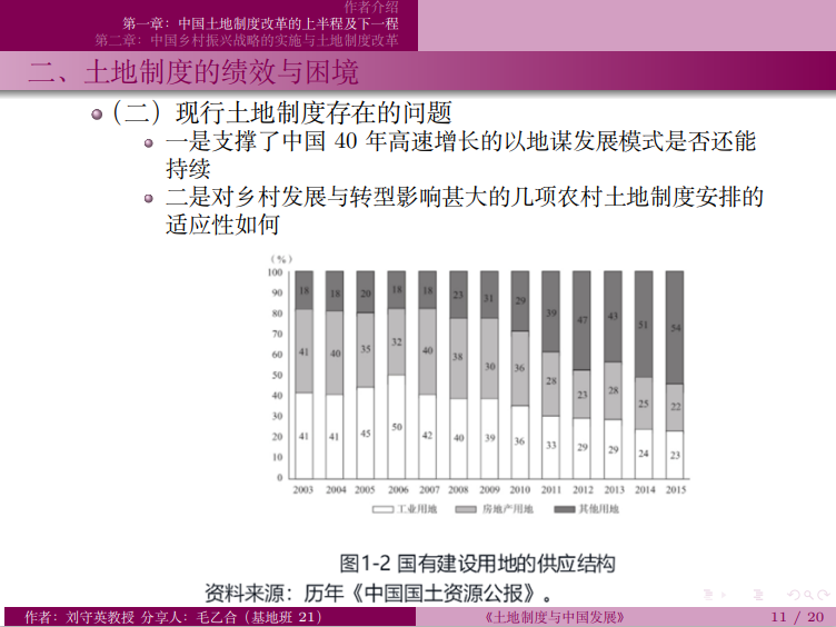 田禹翔同学介绍了本书的最后两章。第十七章主要讲了三大内容:一是卖地模式的基本事实,主要表现为东部受挫,即土地出让收入下降、出让面积增速放缓、价格刚性上涨;西部蔓延,即中西部土地出让收入增速加快、工业化的低成本依赖。统观全国,卖地模式带来的后果有土地宽供应保障经济高增长、工业用地低成本保障工业化、土地扩张及资本化保障城市化。二是卖地模式不能久远的原因。主要从土地出让的成本增加,进而有依附其上的民生制度遭受挑战。三是改革政策,作者主要提出了如下4条建议。一是降低工业用地占比,转为居住及第三产业用地。二是政府和行政单位的划拨用地在市场上交易,对增值土地予以处置。三是城乡结合部土地纳入城市。四是农民工市民化、取消宅基地。第十八章主要讲了四大内容。一是中国土地制度的特征与问题,同时,作者指出当前的土地管理存在如下问题,主要有产权安排的权利二元和权能残缺,市场形式上不同主体进入不平等,土地增值收益分派的问题。管理体制存在目标冲突和职能错位。二是中国现行土地制度与发展方式的转变,土地制度在中国深刻影响着工业化的增长、城市化的进行。三是改革的总体思路和主要内容,包括改革方向、总体思路以及改革的主要内容。
