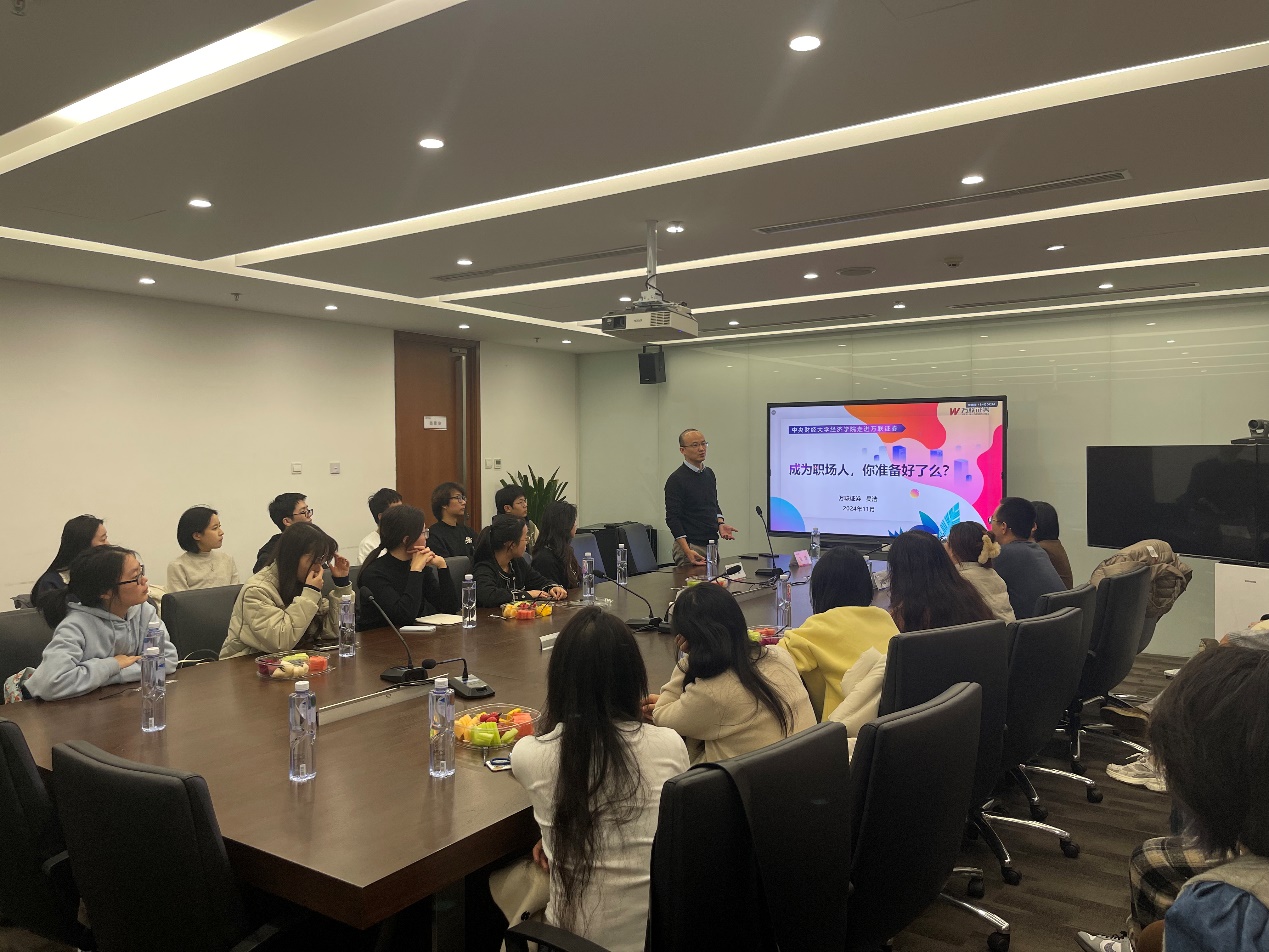 员工徐悦分享了她的求职历程以及在万联证券工作的经历。她围绕券商资管业务范围、与银行理财的区别、个人职业发展路径等话题进行了精彩讲述。在分享末尾,徐悦针对同学们的问题进行了答疑解惑,为同学们提供了宝贵的行业见解和求职指导。